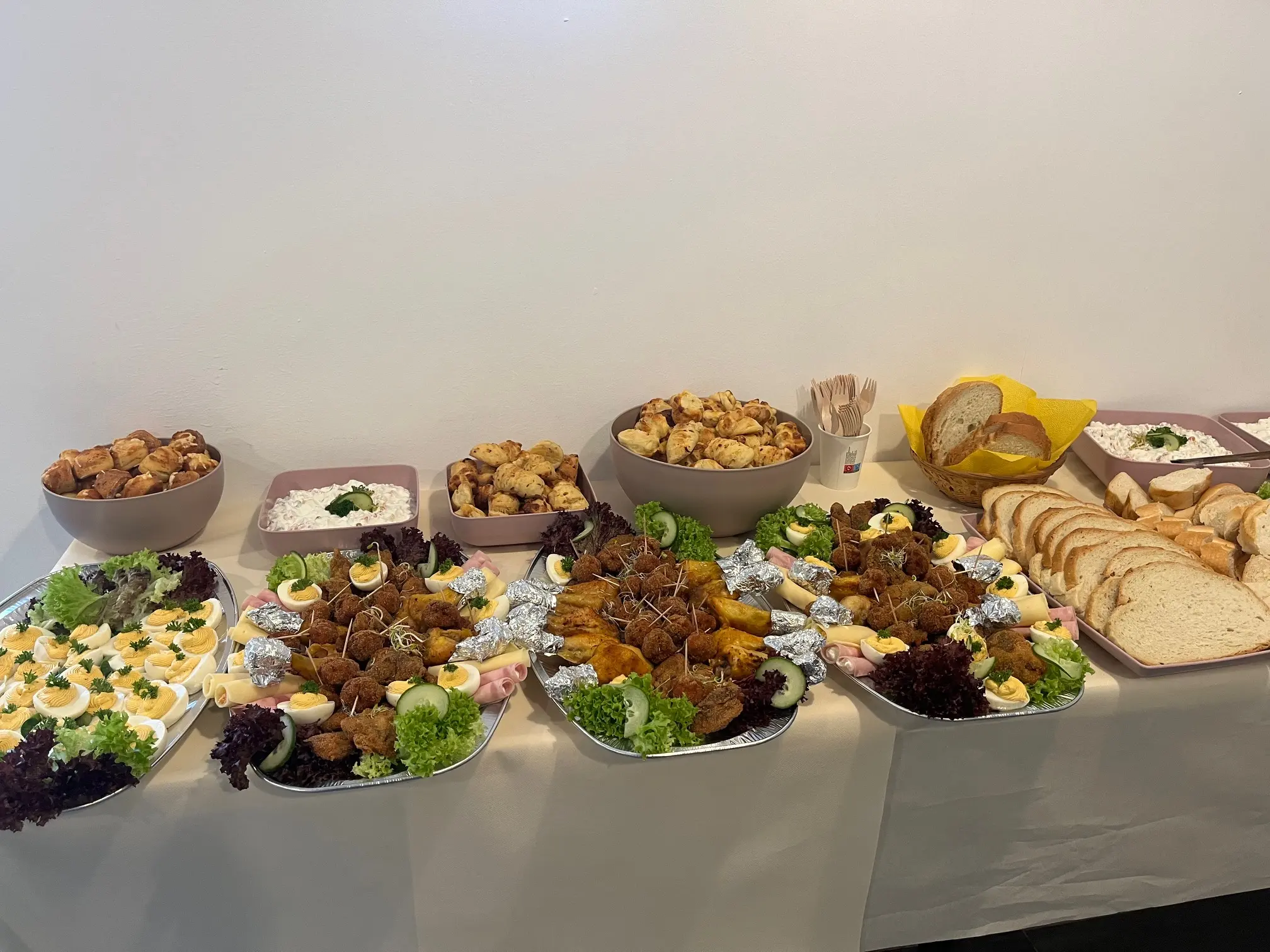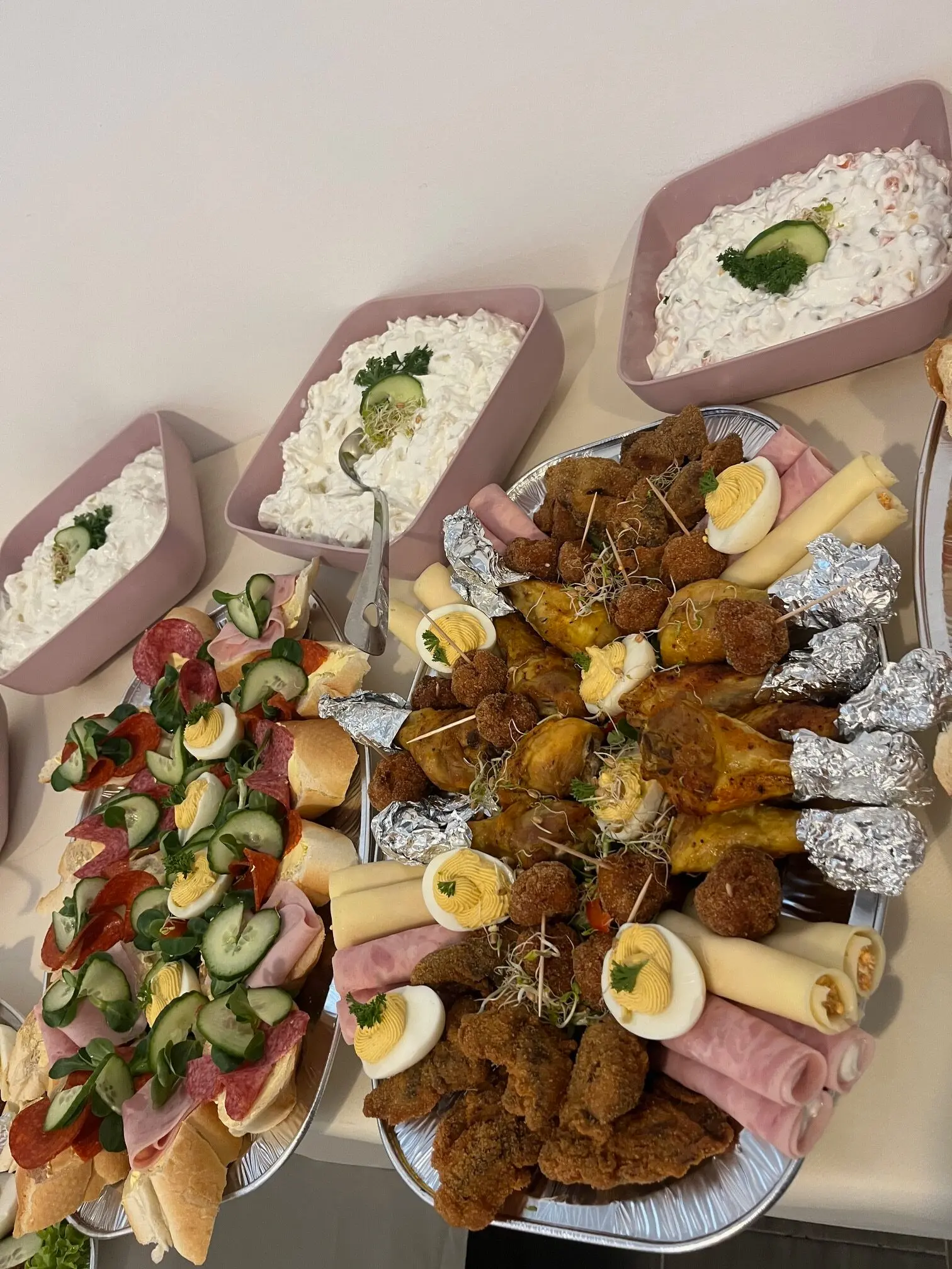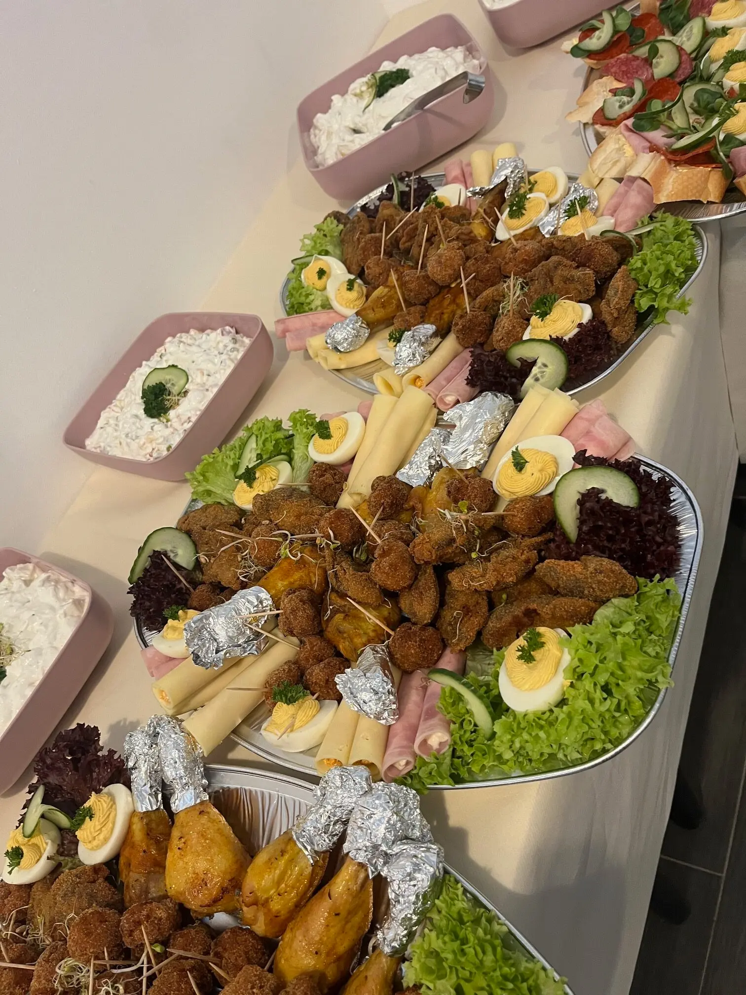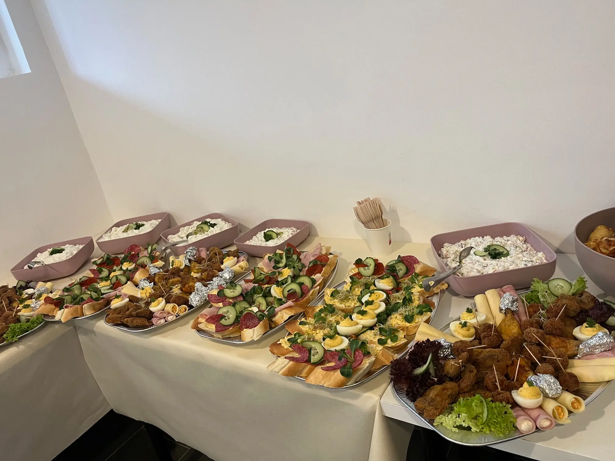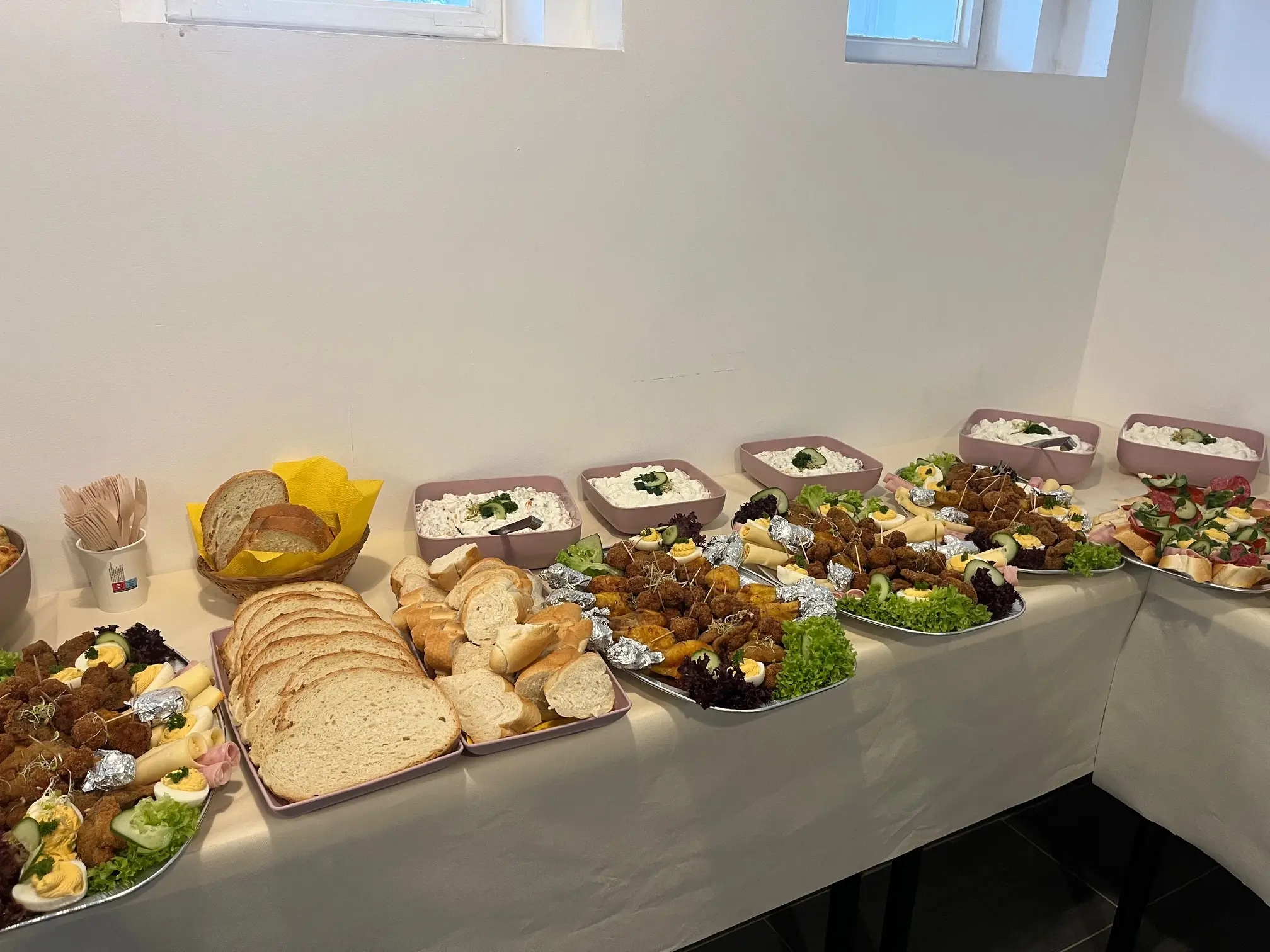 Igény esetén kérhető pl. körözöttes sajttekercs, tormás sonkatekercs, töltött tojás, sült csirkecomb, mini fasírtgolyó, rántott csirkemáj, rántott csirkemell, rántott karaj, franciasaláta, kukoricasaláta, majonézes burgonyasaláta.