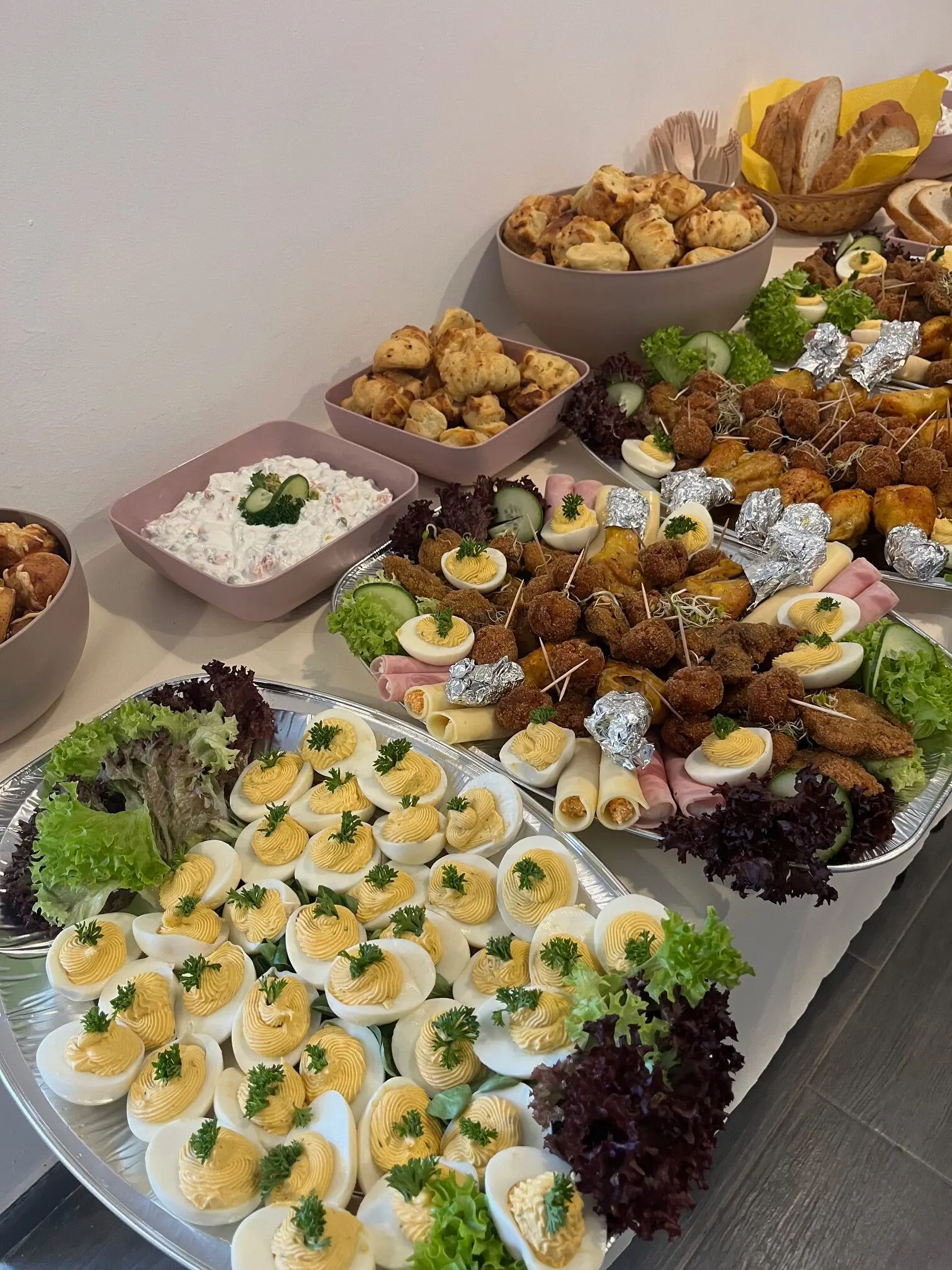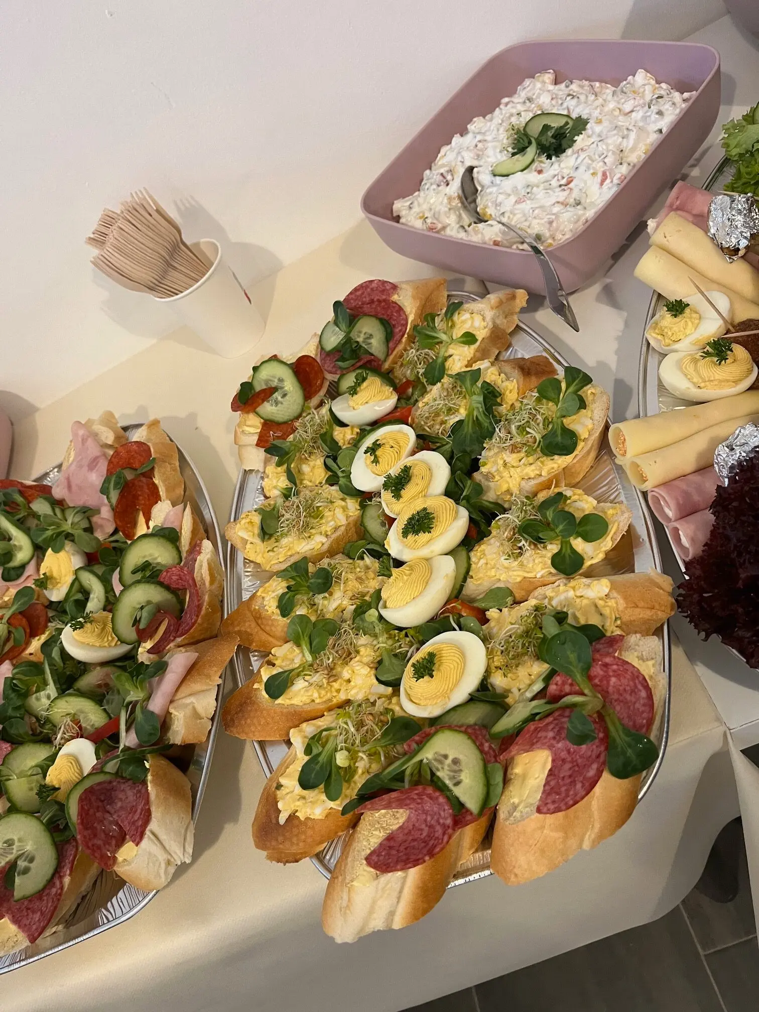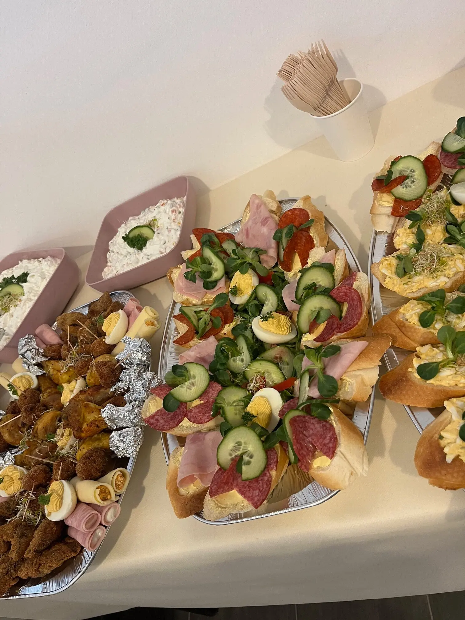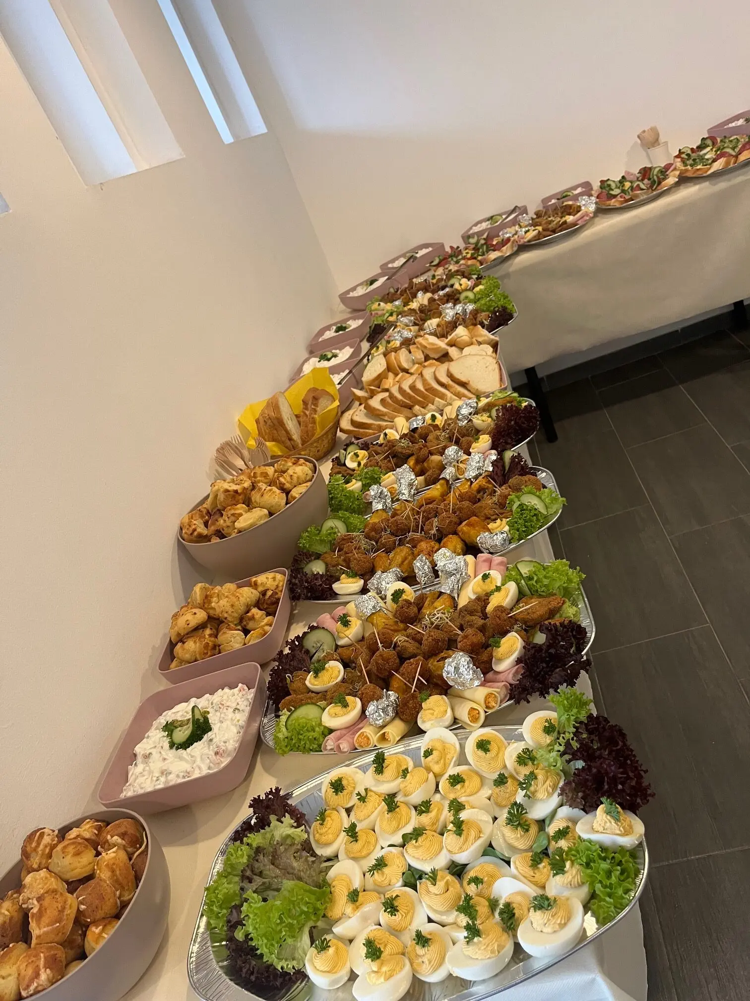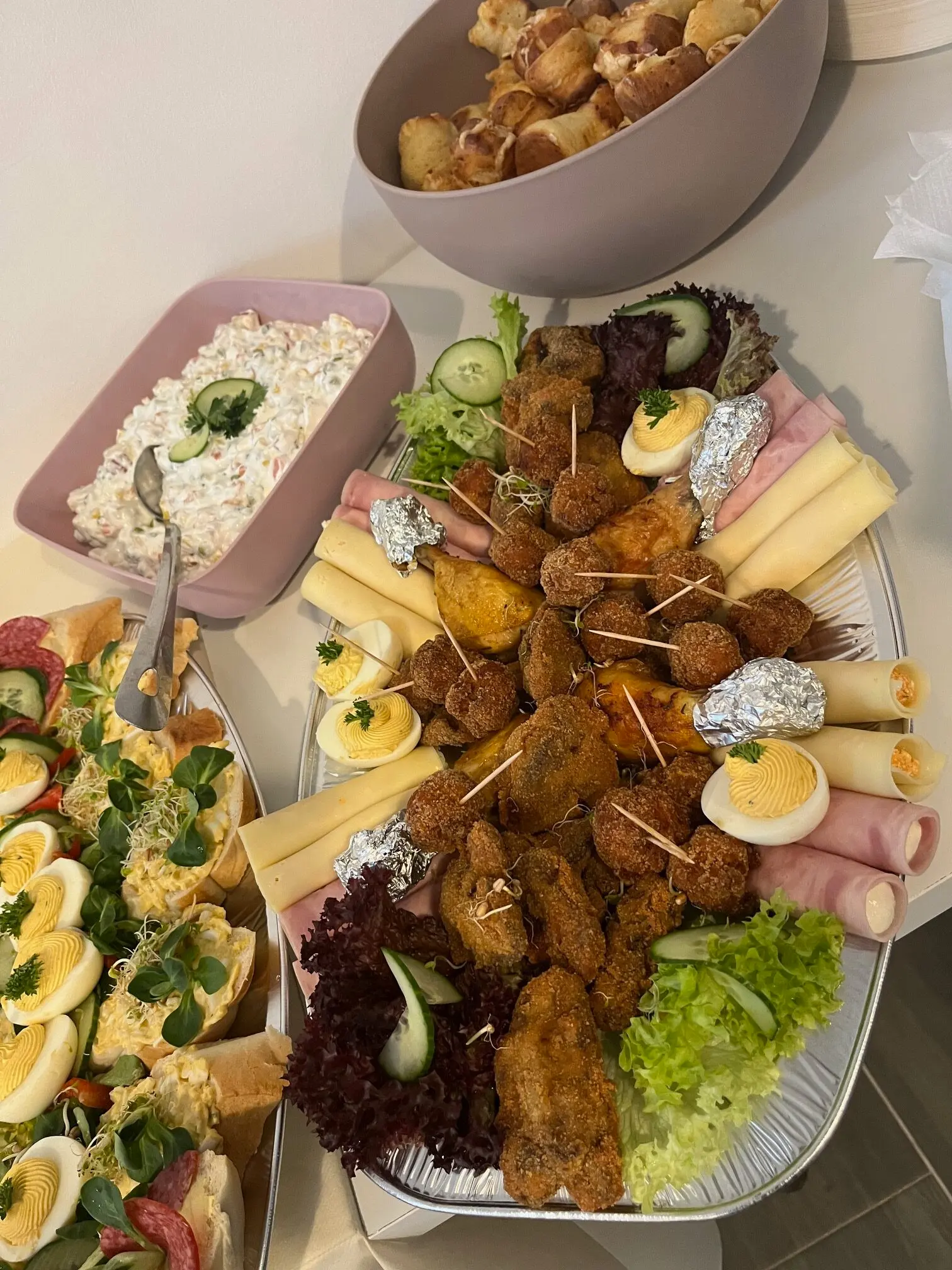 Igény esetén kérhető pl. körözöttes sajttekercs, tormás sonkatekercs, töltött tojás, sült csirkecomb, mini fasírtgolyó, rántott csirkemáj, rántott csirkemell, rántott karaj, franciasaláta, kukoricasaláta, majonézes burgonyasaláta.